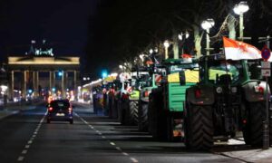 La Berlin, o coloană de zeci de tractoare a blocat bulevardul principal care ducea la Poarta Brandenburg.